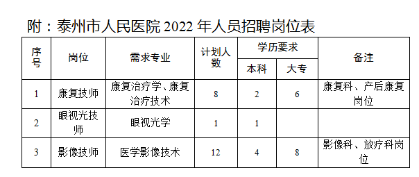 為做好2022年人員招聘考試工作,泰州市人民醫(yī)院決定招聘合同制工作人員21名?,F(xiàn)將有關(guān)事項公告如下: