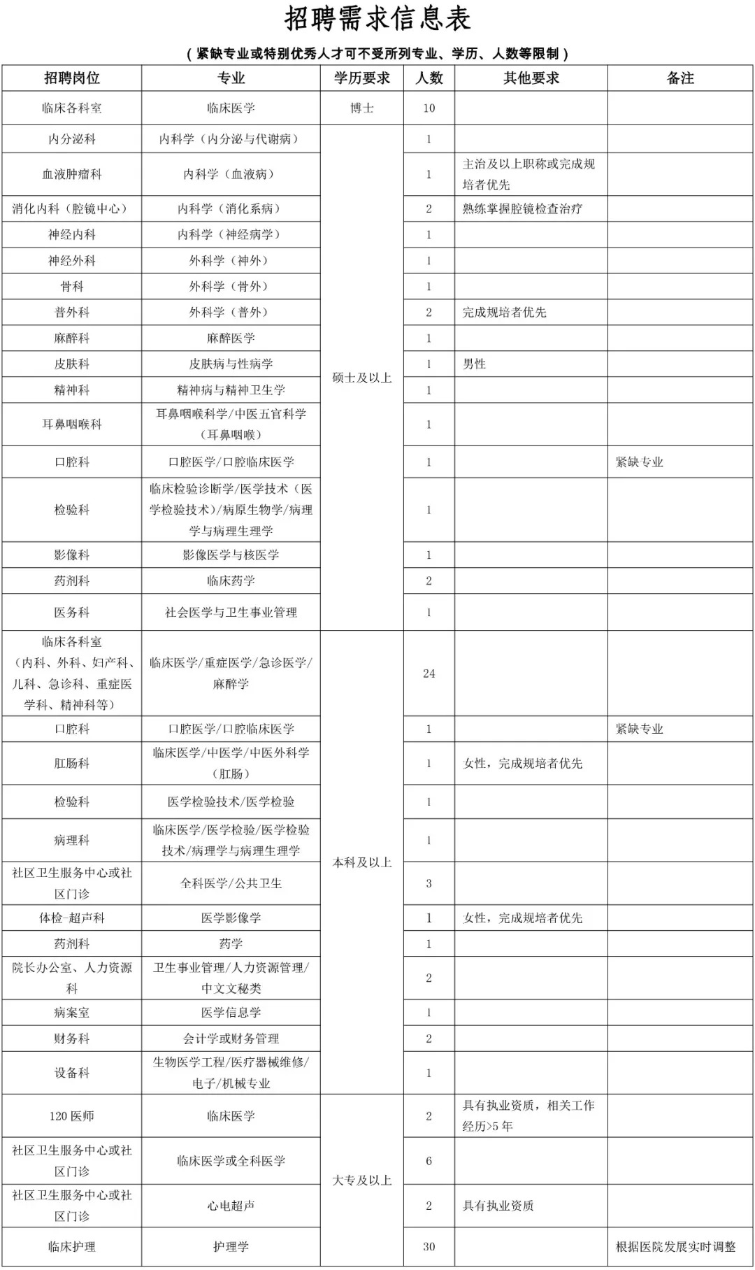 7.有三級醫(yī)院臨床一線工作經(jīng)歷3年及以上或應(yīng)聘緊缺專業(yè)人員,年齡及學(xué)歷要求可適當(dāng)放寬。